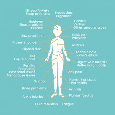 Aches & Pains, Poor Mobility, Sprains, Strains, Sporting Injuries (Golfer's Elbow, Tennis Elbow), Injury recovery, Arthritis, Plantar Fasciitis, Sciatica, Musculoskeletal Issues (neck, shoulder, back, hip, knee & foot problems), Allergies & food intolerance, Hay-Fever, Sinus problems, Irritable Bowel Syndrome, Fertility issues, Asthma, Breathing difficulties, Eczema, Headache/ Migraine, Dizziness, Vertigo & Ear Problems, Babies with latching difficulties, prone to infections, Babies with Colic &, Reflux, Poor Sleep & Irritability, Fluid retention/ Swelling, Poor sleep, Issues with concentration, Low mood, Low energy, Chronic fatigue, Poor flexibility, balance, stability, body awareness and coordination